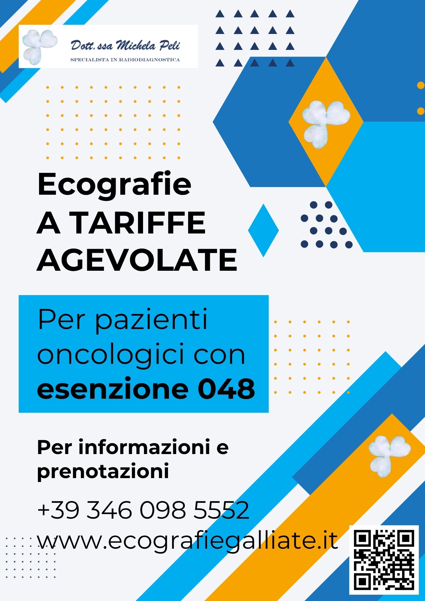 Ai pazienti oncologici che devono eseguire i controlli ecografici periodici, verrà riservata una tariffa ridotta rispetto al prezzo di listino. Sarà necessario presentare l’impegnativa con esenzione 048. Per informazioni e prenotazioni, contattare telefonicamente